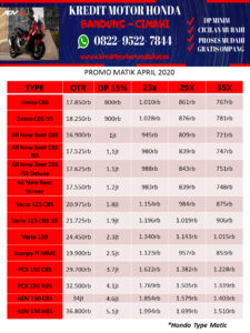 KREDIT MOTOR HONDA BANDUNG 2020, DP mulai 800 Rb dan info harga terbaru dp dan cicilan dan kami deler resmi honda bandung mendukung program pemerintah untuk memutus rantai penyebaran virus Corona dan kamipun sangat peduli akan kesehatan anda sekaligus memenuhi kebutuhan anda untuk memiki kendaraan baru honda, maka dari itu kami memberikan pelayanan dan kemudahan proses online untuk pelanggan setia honda, anda cukup duduk manis aja di rumah.
