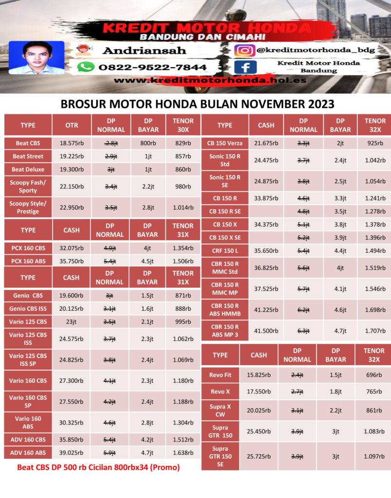 Info lebih lanjut bisa cek daftar harga Promo Spesial kredit motor honda November 2023 Dibawah ini: