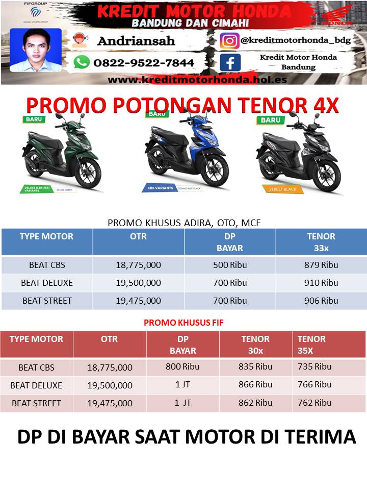 Dapatkan Cicilan Motor Honda Beat yang anda inginkan dengan penawaran menarik dari kredit Motor Honda. Di sinilah tempat menemukan pilihan DP dan promo cicilan bulanan untuk memiliki Beat. Bulan februari 2024, Beat tersedia dengan uang muka hanya Rp 500 Ribu dan cicilan Ringan. Dan masih banyak juga Promo Gratis Potongan 4x Angsuran Promo terbatas. Promo Potongan cicilan Hingga 100ribu per bulannya